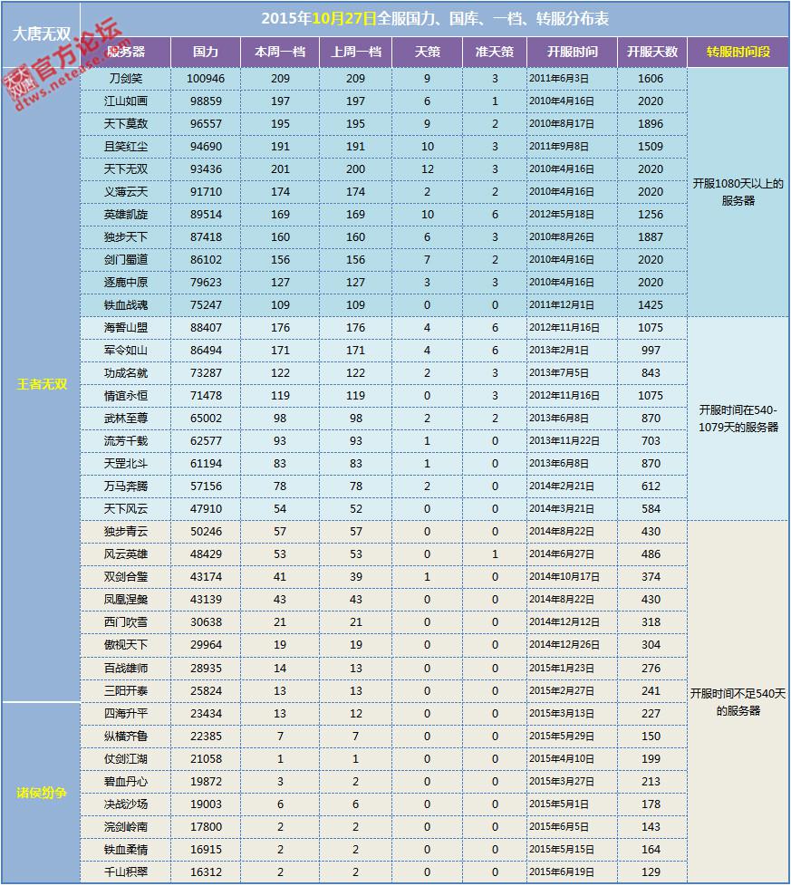 【10月27日】王者、诸侯全服国力、一档、天策、转服分布表