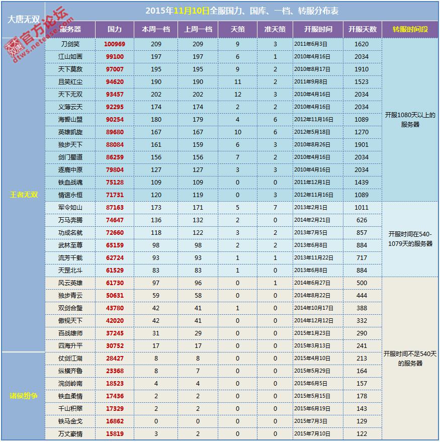 【11月10日】王者、诸侯全服国力、一档、天策、转服分布表