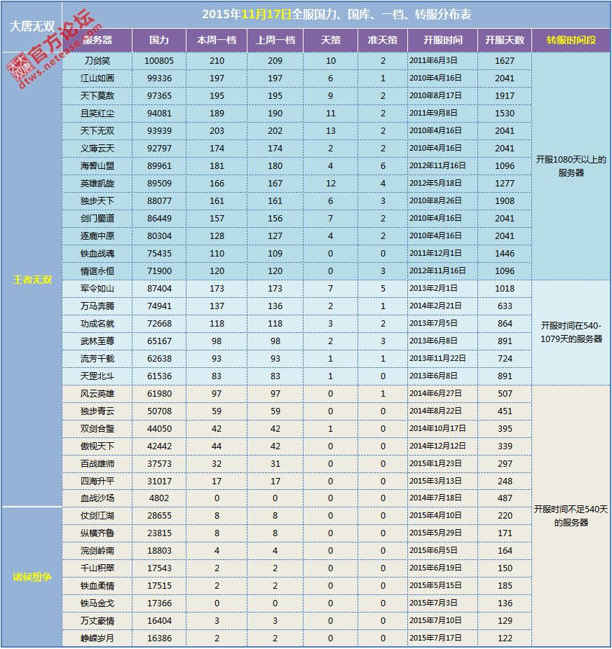 【11月17日】王者、诸侯全服国力、一档、天策、转服分布表