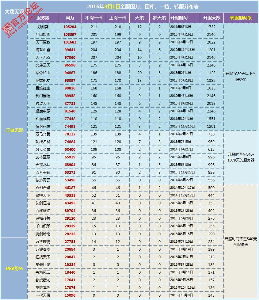 【3月1日】王者、诸侯全服国力、一档、天策、转服分布表 原帖地址:http://dtws.netease.com/thread-679829-1-1.html