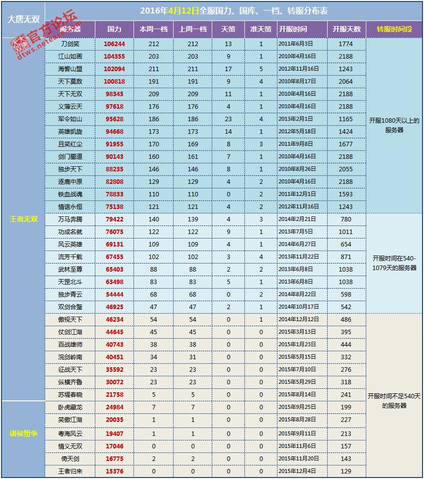 【4月12日】王者、诸侯全服国力、一档、天策、转服分布表 原帖地址:http://dtws.netease.com/thread-695612-1-2.html