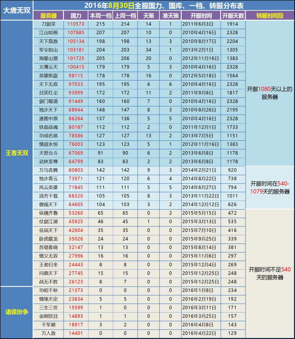 【8月30日】王者、诸侯全服国力、一档、天策、转服分布表 原帖地址:http://dtws.netease.com/thread-744073-1-1.html