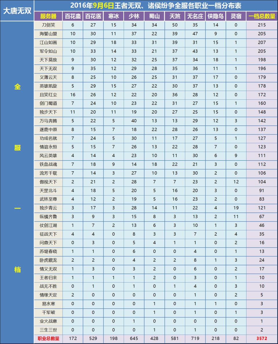 【9月6日】全服各职业一档分布表