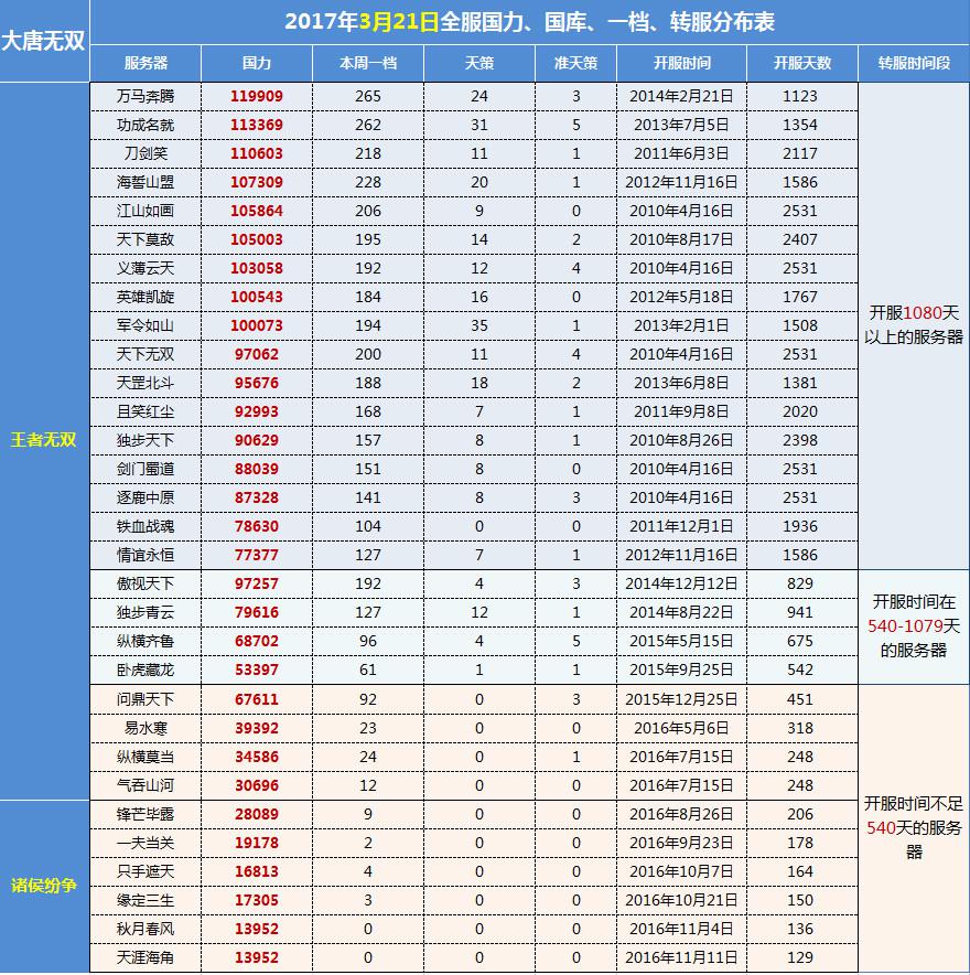 【3月21日】王者、诸侯全服国力、一档、天策、转服分布表 原帖地址:http://dtws.netease.com/thread-847449-1-1.html